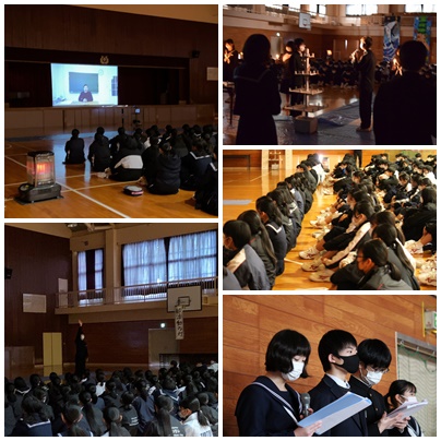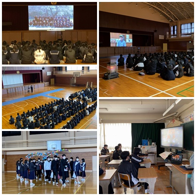 卒業生と在校生の代表は体育館で、代表以外の在校生は教室からオンラインで、橋渡し集会の第1部を行いました。3年間の思い出のスライドを鑑賞し、昨年までお世話になった先生から卒業に向けての温かいメッセージをいただきました。