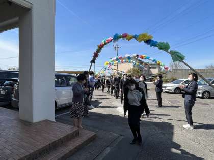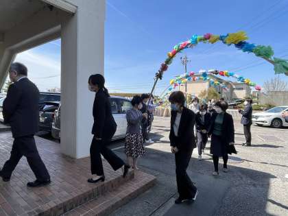 「犬山市公立学校教職員 辞令・発令通知書伝達式」の後、本校に異動された13名の教職員の先生方をお迎えしました。