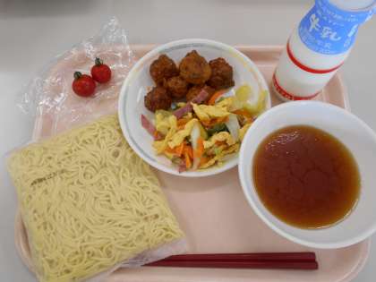 冷やし中華めん 冷やし中華の具と冷やしスープ 肉だんごの野菜あんかけ ミニトマト 牛乳です。