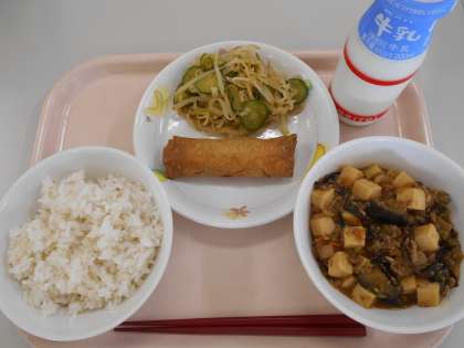 麦ご飯 マーボーなす 愛知のしそ春巻き 中華サラダ 牛乳です。