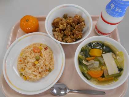 石上げピラフー 自分で石上げ唐揚げ 5色の彩り野菜スープ 冷凍みかん 牛乳です。