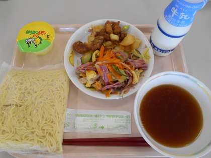 冷やし中華 鶏肉とじゃがいもの揚げ煮 はちみつレモンゼリー 牛乳です。