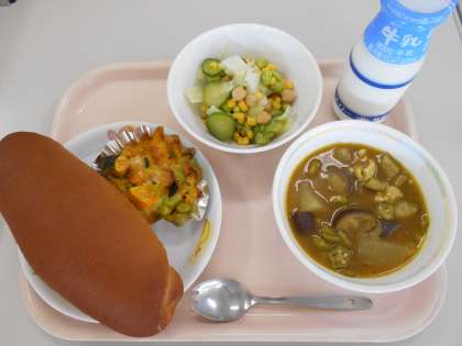 くろロールパン かぼちゃ入りチーズ焼き とうがんのカレースープ 枝豆とひよこ豆のサラダ 牛乳です。