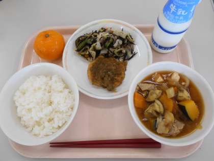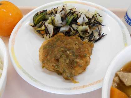 白飯 サーモンバーグのしそおろしがけ キャベツの梅ひじきおかか和え 夏野菜の味噌汁 冷凍みかん 牛乳です。