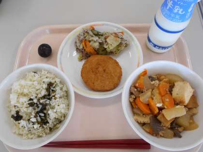 わかめご飯 里芋コロッケ 豚肉と大根の煮物 ゆかり和え 巨峰 牛乳です。