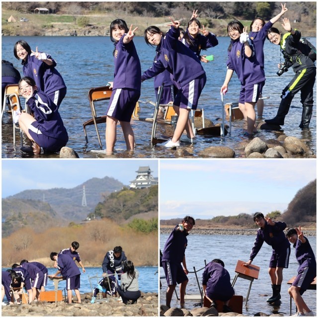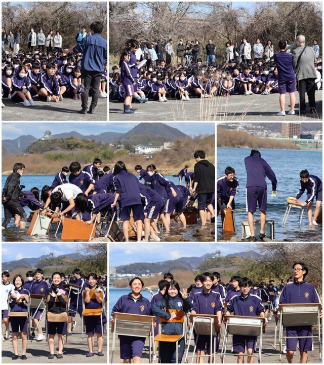 始めにこの行事が始まった第2回卒業生の佐藤さんよりお話をお聞きした後、感謝の思いを込めて木曽川で机と腰掛けを洗いました。