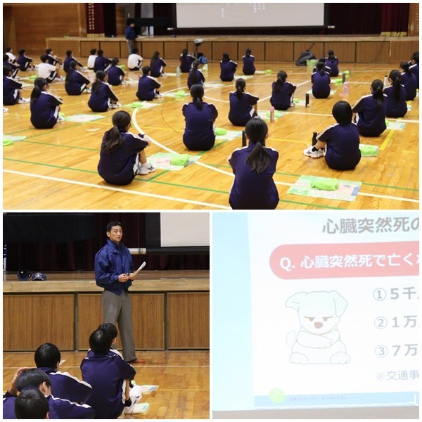 今日は、犬山消防署の方々が講師となり、心肺蘇生法を学び、どの子も真剣に取り組む姿が見られました。身近な人が、急性心不全で倒れることは、想像したくありませんが、あり得ることです。そのとき、身近な人がAEDの使用法も含め心肺蘇生ができるかできないかで、おじいちゃん、おばあちゃん、お父さんの生死が変わってきます。今日、学んだことをしっかりマスターして、緊急時に備えて行きましょう。