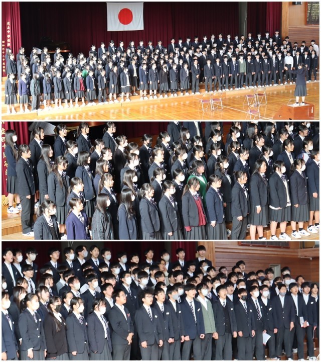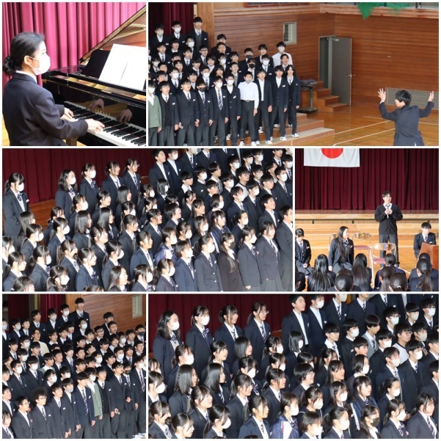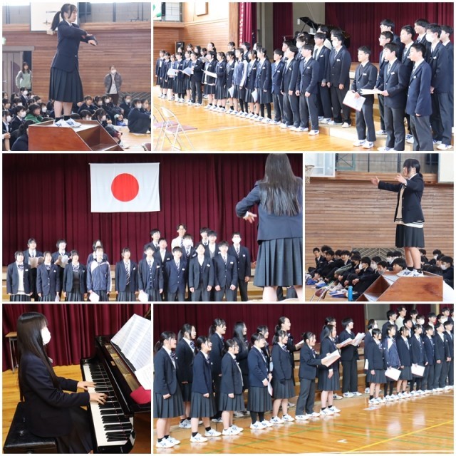 始めに有志合唱団の模範合唱がありました。気持ちのこもった合唱に学年全体の士気も上がりました。その後、リハーサルとして本番と同じ流れでこれまで3年間積み上げてきたメドレー合唱に取り組みました。どこまで感動的な合唱が披露できるか楽しみです。