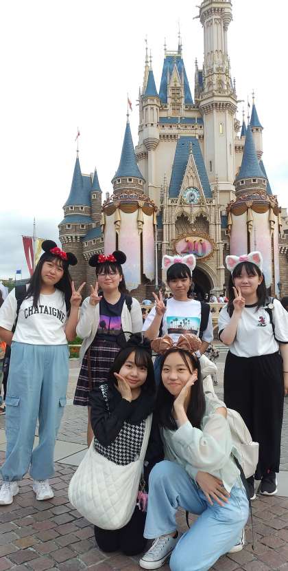 シンデレラ城の前、やっと生徒たちに会えました。やっと先生に会えました。