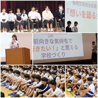 その後、生徒自治会執行部の認証式がありました。その際の決意表明では、「短い時間でも、語り合える学校」、「あいさつがきちんとできる学校」「掃除が時間いっぱいできる学校」「ありがとうの感謝の言葉が伝え合える学校」などをめざしたいとの思いが伝えられました。