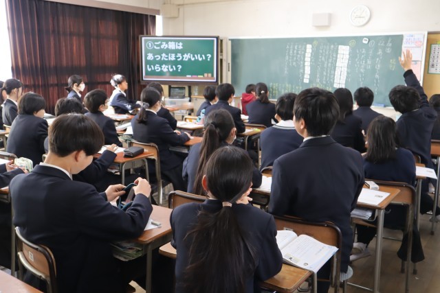 今日は身近なテーマ、ゴミ問題。ゴミ箱はあったほうがいい?ゴミ箱を通じて自己を見つめ、よりよい社会の実現に向け判断力や心情を育てる授業です。