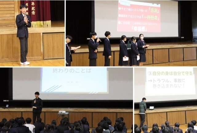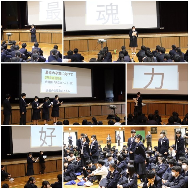 その後、学級代表者会より、三年生を送る会・旅立ちの会に披露する合唱曲等の紹介と、練習への心構えが伝えられました。その後、先生方から進路関係の話などがありました。