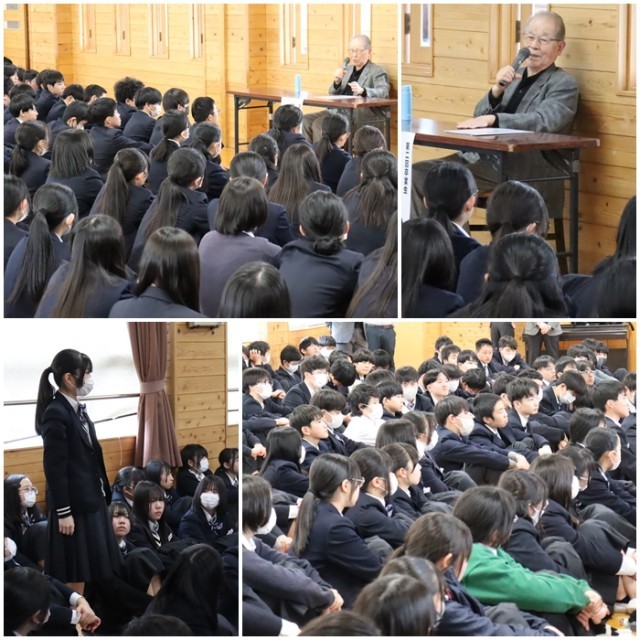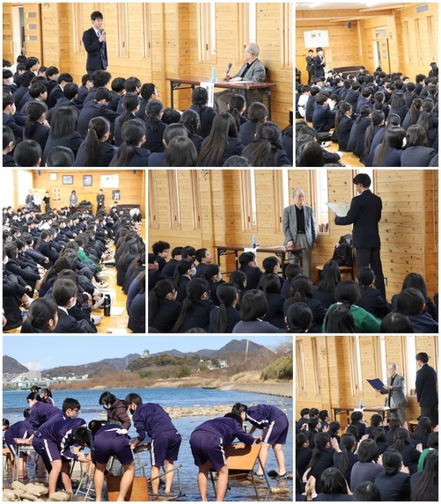 本日は、犬山中学校第二回卒業生で当時自治会長であった佐藤様から、伝統行事の机腰掛け洗いを始めた当時の思いを語っていただきました。戦後で物資が少ない中、新しい校舎や新しい机を準備していただいたことへの感謝の気持ちからこの行事が始まり、その「感謝」の思いが長年にわたり脈々とこれまで受け継がれてきたことを、今日のお話から知りました。「当時の生徒は、本当に純粋で、逞しかった。犬山中学校には、こういう先輩たちの精神が脈々と引き継がれている」という言葉がとても印象的でした。尚,、机腰掛け洗いの写真は、一昨年HPに掲載した写真の再掲です。当日が一昨年のような穏やかな机腰掛け洗い日和になると信じています。