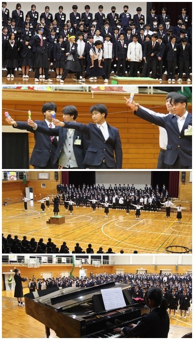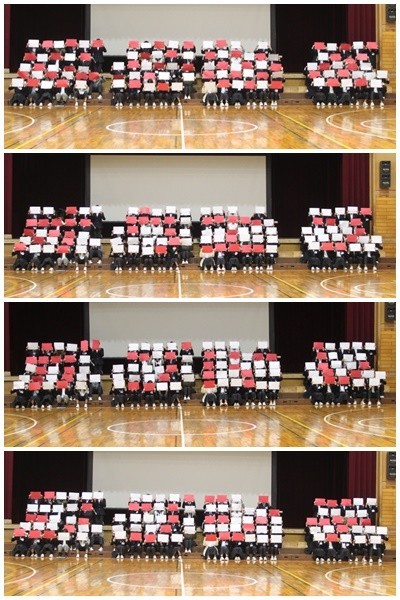 本番では、これまでの練習以上に声がよく出ており、動きや間の取り方、パネル文字への隊形移動の仕方なども工夫がされていました。