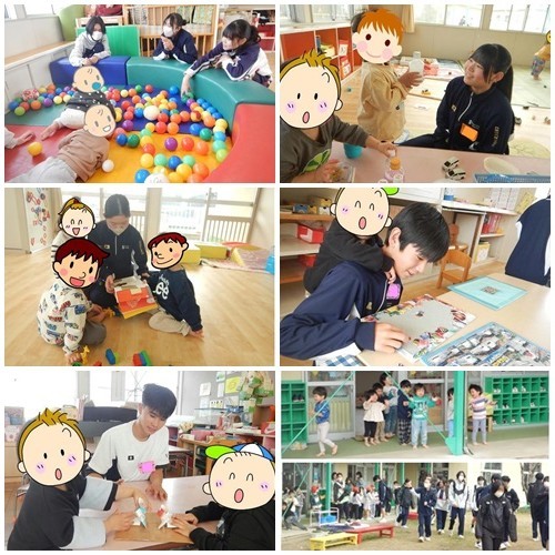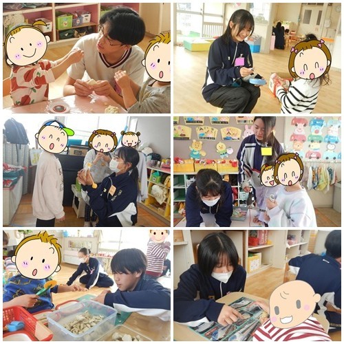 保育園実習第3弾です。今日は2年2組の生徒が保育園を訪れました。生徒の到着に園児たちは待ちきれない様子で、教室から大きく手を振ってくれていました。生徒にとって保育園での実習は初めてでも、園児にとっては3回目なのでとても慣れてきていて、生徒との距離はかなり近くなっていました。中には生徒の手を引いて自分に興味を引かせようとする園児もいました。そんな園児たちの振る舞いに、生徒はどのように対処すればよいか困惑する場面もありました。こう考えると保育士さんたちは上手に園児たちをコントロールしていますね。保育士さんたちの苦労を生徒たちも感じ取ることができたでしょう。次は2年4組です。最後の訪問となります。園児の期待に添えるよう皆さんがんばりましょう。