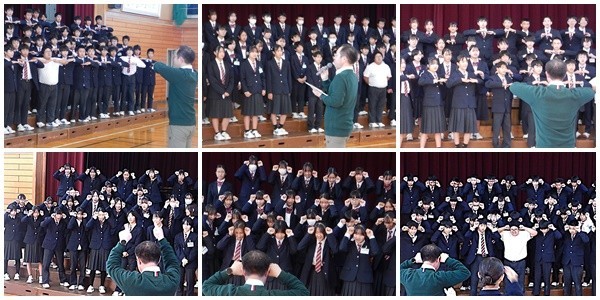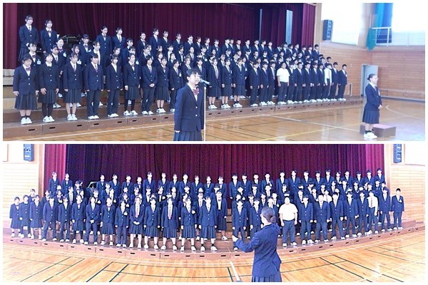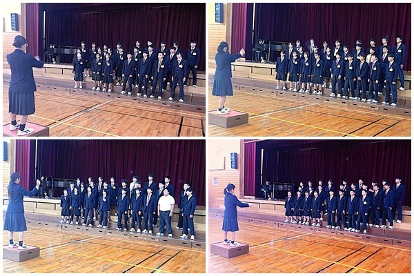 今日の学級の時間は、前半に学年全体で“合唱プレ発表会”を行いました。各学級が、現在の学級合唱の進捗(しんちょく)状況を披露したり、市民文化会館を想定した入退場の仕方や曲紹介者の動きなどを確認したりしましました。また学年合唱の入退場や曲紹介の練習も行いました。また後半の時間には、音楽科の先生に合唱指導をしてもらいました。指導では、お腹から湧き上がる声の出し方や頭から声を出すイメージなどを、体の動きを使いながら教えてもらいました。これによって、教えてもらう前と後の合唱でワンランク上がったような歌声を聞くことができました。今日学んだことは、学年合唱だけでなく学級合唱にも活かせる練習方法かと思います。ぜひこれを取り入れながら、合唱発表会当日まで、常に高みを目指して、「自分たちを」「学年全体を」磨き上げて行ってほしいです。