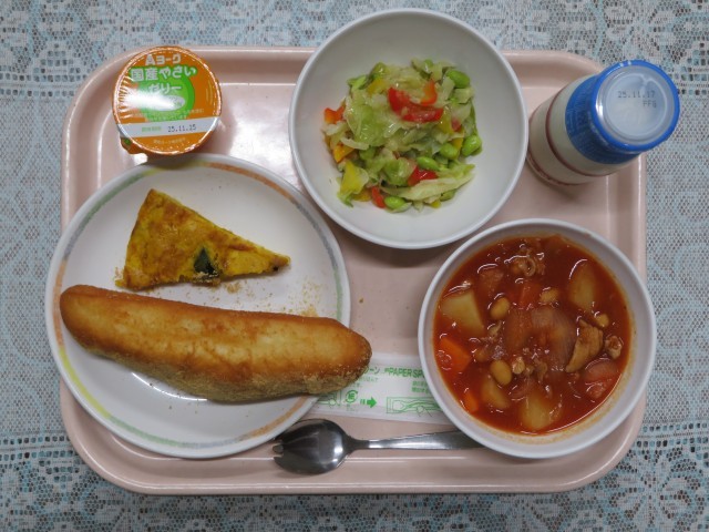「ポークビーンズ」は、豚肉と白いんげん豆をトマトなどで煮込んだアメリカの家庭料理です。日本では、給食でよく食べられていますが、白いんげん豆の代わりに大豆が使われることが多いです。中学生に必要なたんぱく質がたっぷりの料理です。