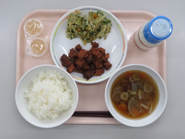 今日の給食は、「犬山をど~ん!と味わおう」献立です。「まぐろと大豆deお城の石垣丼の具」は、まぐろと大豆、生揚げを、犬山城の石垣に見立てています。また、「キャベツの犬山茶あえ」に使われているてん茶、「犬山桃ゼリー」に使われている桃は、犬山産の食材です。