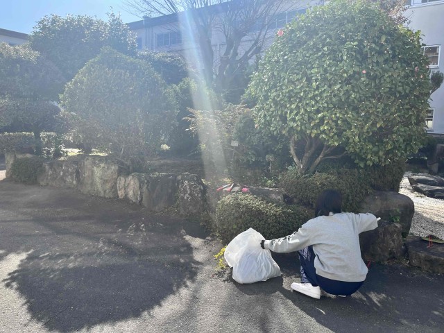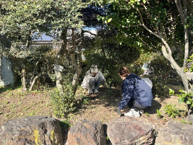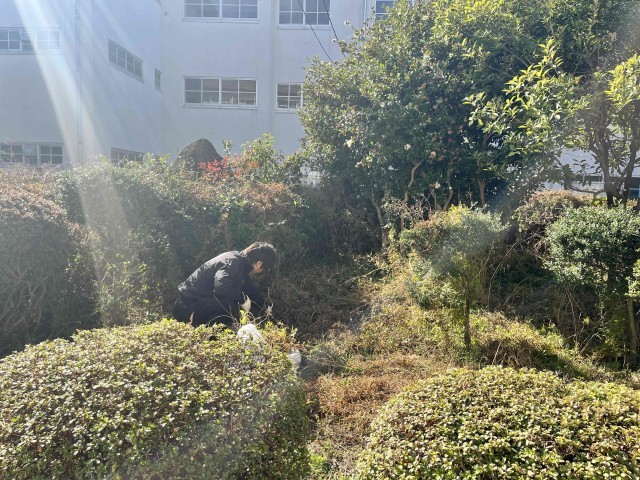 本日は、PTA役員の皆さんに協力いただき、枯山水の周りや中庭の除草作業をしました。