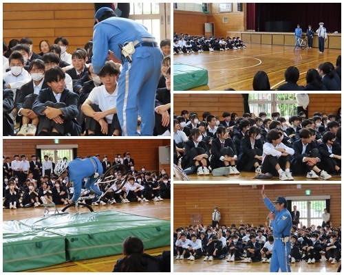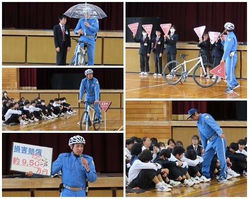 今日の5限は、全校生徒を対象とした『交通安全教室』を実施しました。犬山警察から講師を招いて、「自転車の安全」について考えました。講演では、正しいヘルメット着用の理解や正しい交通ルールの確認などについて、実演を交えながら説明していただきました。また、4月から始まった自転車の罰金制度についても理解を深めました。この罰金制度について、中学生は対象外となりますが、罰金に値する行為が大きな事故を引き起こす原因となることを学びました。実際に過去に小学生が起こした“自転車事故"の事例を挙げ、裁判所が保護者に高額な賠償金を請求した話を聞き、驚く場面もありました。また昨年度、犬山市の小学生が自転車による交通事故で亡くなったという痛ましい事故も現実に起こっています。"自分だけは大丈夫"と奢(おご)らず、きちんと交通ルールを守りましょう。