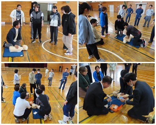 生徒が下校した後、犬山消防署の方の指導の下、南部中の職員で『心肺蘇生法』の訓練をしました。この活動は、毎年水泳が始まるこの時期に、全職員を対象に行っているものですが、この救急法は、災害や事故、アナフィラキシーなどの場面でも必要となるものです。今日は「胸骨圧迫法」や「AEDの使用法」を単に練習するだけでなく、生徒が倒れた場面を設定して、その場面に対する職員の対応法について、活動しながら確認しました。皆さんの命や安全を守るための勉強を職員も常に行っています。3年生の皆さんも、2年生の時に学びましたね。