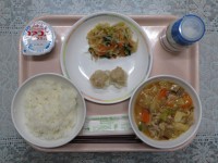 今年度はじめての麺の日です。給食では、麺の日も野菜がたっぷりとれるように具だくさんにしています。野菜の甘みやうま味がスープにでています。