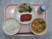 山菜入り五目うどん ちくわの西尾抹茶揚げ 野菜の塩昆布あえ 犬山みかんジャム蒸しパン(手作り) 牛乳 です。