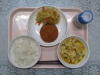 今日の給食は、揚げパン 煮込みハンバーグ 枝豆サラダ パスタとキャベツのスープ 型抜きチーズ 牛乳 です。