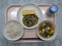 今日の給食は、麦ご飯 千草焼き 春の煮しめ ゆかり和え 牛乳 です。