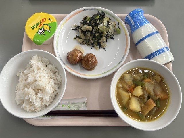 今月の給食目標は、「栄養バランスを意識して食事をしよう」です。学校給食は、中学生のみなさんの1日に必要な栄養素の3分の1を摂れるように、献立を考えています。栄養バランスをよくするためには、6つの食品群を取り入れたり、主食・主菜・副菜・汁物を組み合わせたりするとよいです。