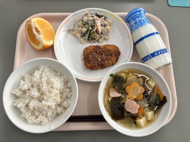 今日の給食は、「3年生の受験応援献立」です。受験に勝つという意味を込めた「ソースカツ」、先が見通せるという意味があるれんこんを使った「れんこんのごまドレサラダ」、昔から合格祈願の縁起物として親しまれている、梅の花の形をしたかまぼこを使った「合格すまし汁」、いい予感という語呂合わせの「いよかん」で3年生の受験を応援しています。