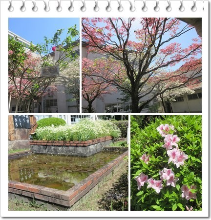 「正伸園」では、白とピンクのハナミズキが南中生にエールを送るように咲き誇っています。