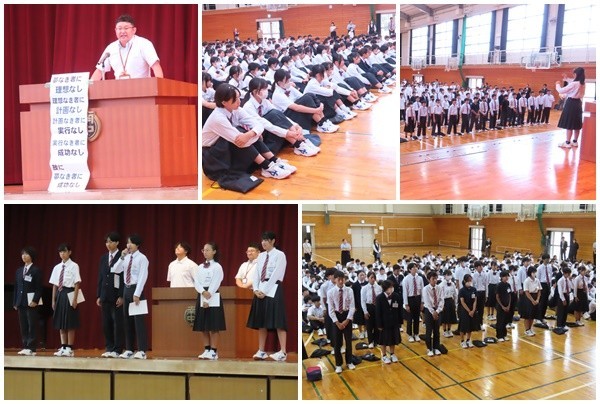 今日は前期の終業式でした。集会では校長先生が前期の出来事の振り返りや成績について話されました。その後の表彰伝達では、市大会や夏休みの応募作品の入賞者等の表彰を行いましたが、夏休みすぎからは、2年生も表彰される姿が多くなりました。