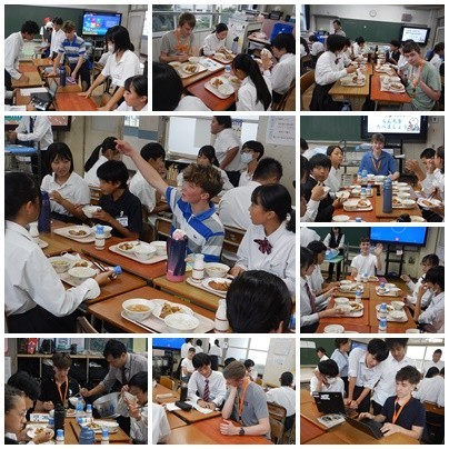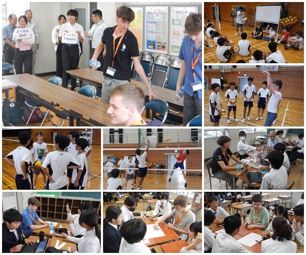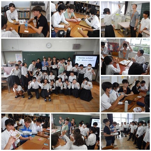 体育科の授業のバレーボールでは、一緒に試合をしたり、ドイツの学生チームと交流試合をしたりしました。英語科の授業では、英語での自己紹介ゲームやすごろくゲームをして盛り上がっていました。給食の時間には、積極的にコミュニケーションを図ろうとしている2年生の姿が微笑ましかったです。