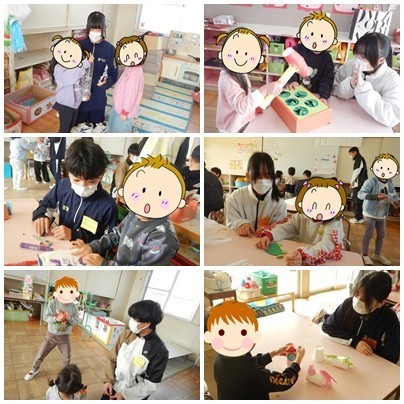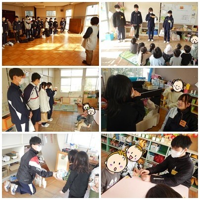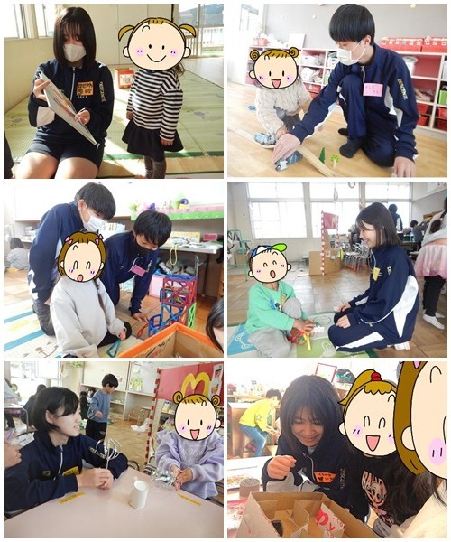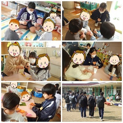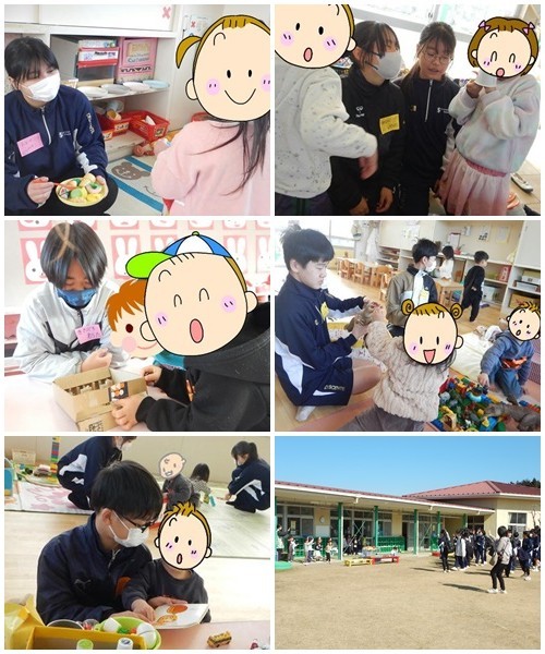 家庭科の授業の一環で、今週より『保育園実習』が始まりました。その1番手として2年3組が近隣の保育園に出かけて行き、0歳児から6歳児と交流を行いました。園児との交流を図るために、生徒たちは手作りのおもちゃを持参し、一緒に遊びながら、幼児の様子を観察しました。手作りのおもちゃに対して目を輝かせていた園児たちの姿には、生徒たちもうれしさを隠せないようでした。最初はなかなかなじめなかった生徒もいましたが、園児たちの積極的な声かけにより、最後にはしっかりとなじんでいました。たった1時間の体験でしたが、最後には生徒も園児も別れを惜しむように互いに手を振り、さよならをしていました。次は2年1組が実習に出かけます。園児たちもきっと楽しみにしていますよ。