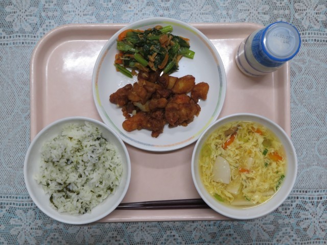 「高菜漬け」は、アブラナ科の高菜という葉野菜を漬物にしたもので、「日本三大漬け菜」として、九州地方で食べられてきました。高菜は、緑黄色野菜のひとつで、βカロテンやビタミンCが豊富に含まれています。高菜はごはんのお供としてだけでなく、油で炒めたり、卵や肉と一緒に炒めたりする食べ方も人気です。今日の給食では、高菜を使ったチャーハンを、給食室で作りました。