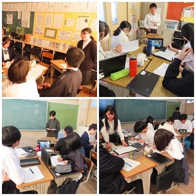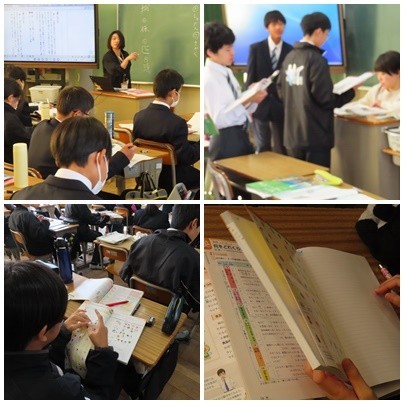 3年生国語科の授業では、自分の意見をまとめて発表し、それに対する質疑応答をしています。3年生だけあって、とてもしっかりと発言しています。英語科では、先生に自分の発音を確認してもらっています。家庭科では、食材を6つの食品群に分類しています。