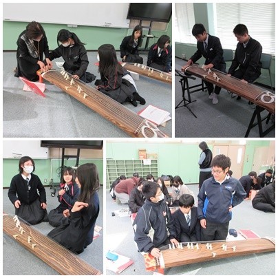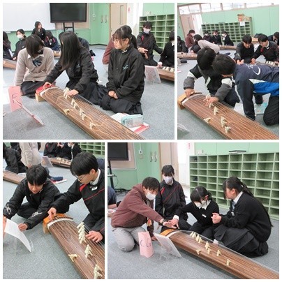 音楽で、箏の学習をしました。講師の先生にわかりやすく教えていただき、「さくらさくら」を楽しく演奏していました。