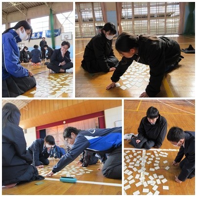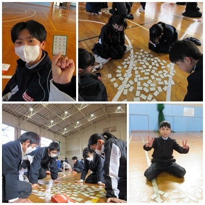 百人一首大会を行いました。肌寒い体育館が、熱く盛り上がりました。