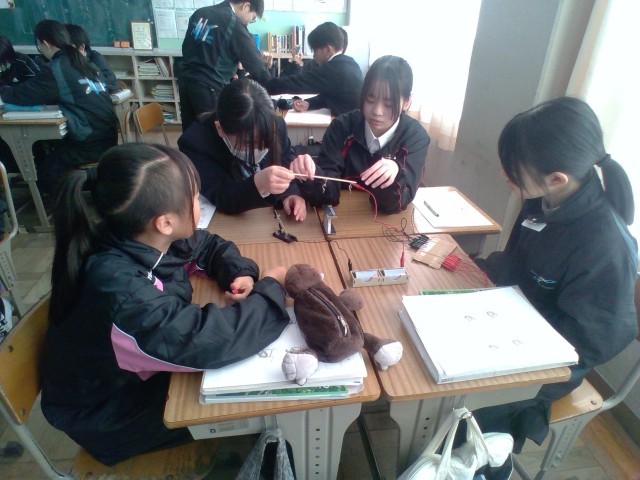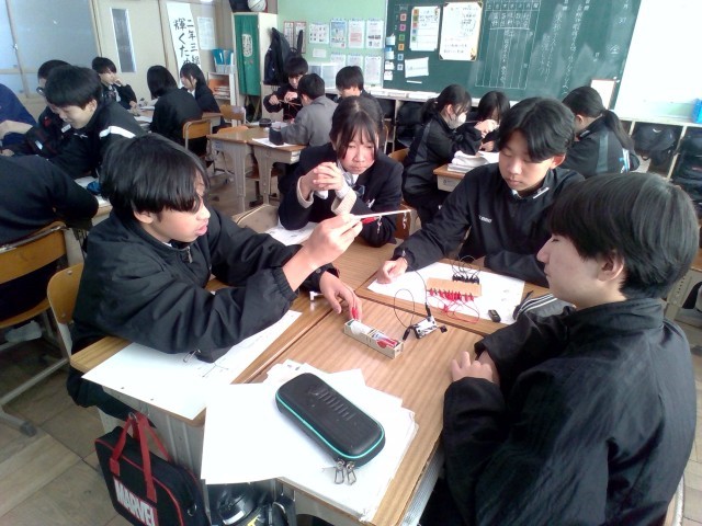 理科の授業ではモーターの仕組みを調べる実験を行いました。実験結果から動きが変化する条件について考察しました。