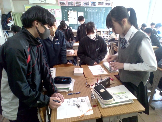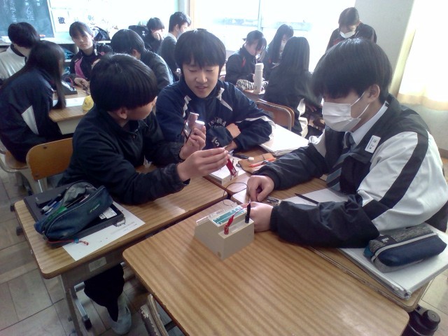 理科の授業では、コイルや磁石を使って電流を発生させる実験を行いました。発生する電流の向きや大きさを変化させる方法を調べました。