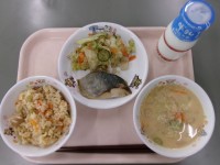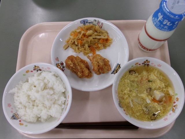 ご飯 鶏の唐揚げ 切り干し大根の煮物 かきたま汁 牛乳 です。