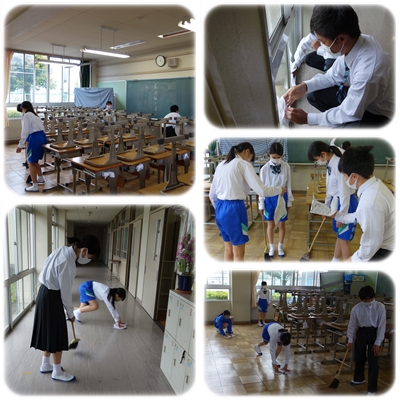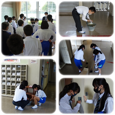1年生の清掃の様子です。小学校とは清掃の仕方に違いもあり、戸惑うこともあると思いますが、仲間と役割を分担して、一生懸命取り組めています。学校をきれいにしてくれてありがとう!