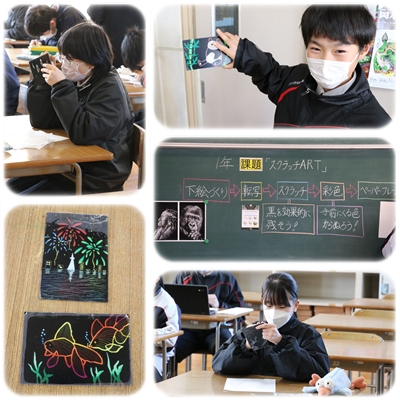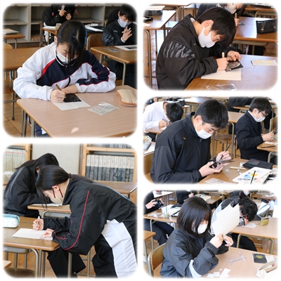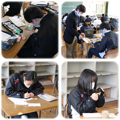 1年生の美術の様子です。繊細な作業を集中して行っています。それぞれ進み具合は異なりますが、ぞくぞくと魅力的な作品が出来上がってきていました。とっても素敵な作品ですね。すばらしいです。みなさんの完成品、ぜひ見せてくださいね。完成が楽しみです。