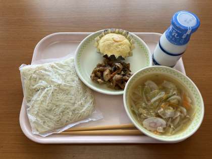 中華麺、野菜しおラーメン、牛乳、ホキと大豆の野菜あん、犬山はちみつレモン蒸しパンです。