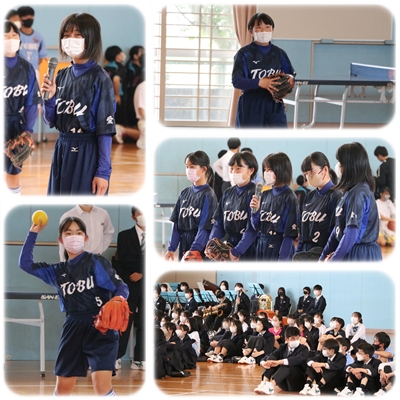 男子バスケットボール部、ハンドボール部、ソフトボール部の紹介の様子です。ユニークな紹介もあり、思わず笑顔がこぼれました。