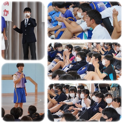 部活動紹介の後は、縦割りブロックの抽選を行いました。進行役の2人が場を盛り上げてくれました。1年間この縦割りの仲間で、様々な活動を行っていきます。3年生の皆さん、後輩を引っ張っていって下さいね。