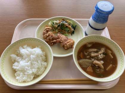 白飯、牛乳、鶏のから揚げ、小松菜のなめ茸和え、豚汁です。
