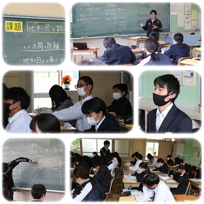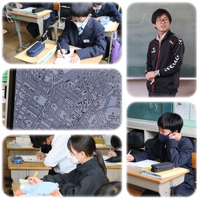 2年生の社会では歴史の学習を進めていますが、今日地理の学習を行っていました。国土地理院が発行している「地形図」を読み取る学習です。縮尺を考えて実際の距離を考えました。3年生の数学の学習でも同様の学習を行っていきます。覚えておいてくださいね。