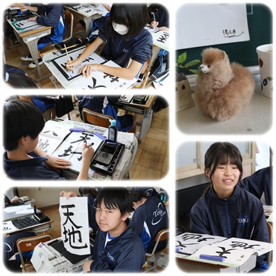 「天地」の清書に取り組みました。ポイントを意識し、上手に書くことができましたね。しかし、その後意外と苦戦するのが名前を書くことです。「小筆」って難しいですよね。自分の経験でも、小筆で苦戦したことを覚えています。